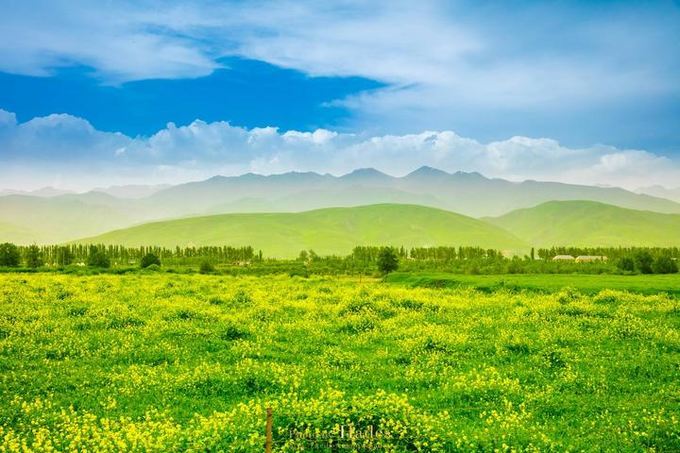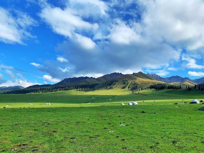 那拉提草原是發(fā)育在第3紀(jì)古洪積層上的中山地草場,東南接那拉提高嶺,西北沿鞏乃斯河上游谷地?cái)嗦?,地勢大面積傾斜,是鞏乃斯草原的重要夏牧場,年降水量在880毫米左右,年平均氣溫在20攝氏度左右。
